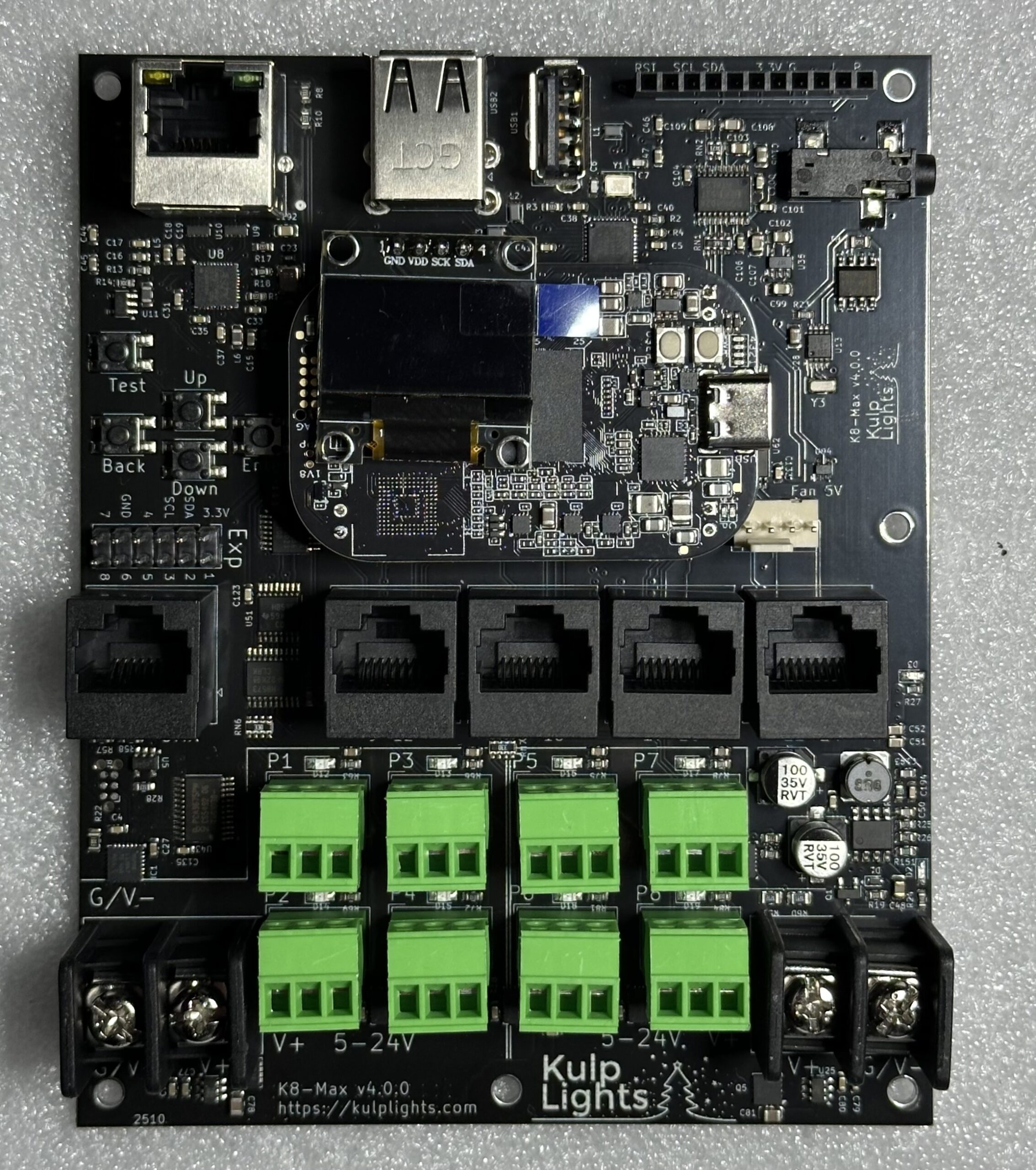 The K8-Max has a Real Time Clock (RTC) to maintain time, a temperature sensor, input voltage sensors, an OLED display with navigation push buttons, three powered USB ports, onboard sound, socket for FM transmitter, and a Gigabit Ethernet port (wired via USB2 so roughly 300Mb/s speed).